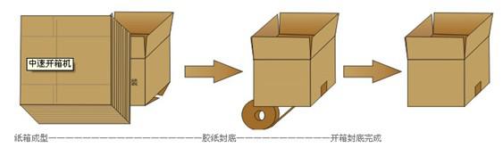 開箱機(jī)是指自動完成開箱、成形、下底折葉折曲。并現(xiàn)時完成下部分膠帶粘貼,將疊成紙板的箱板打開,箱子底部按一定程序折合,并用膠帶密封后輸送給裝箱機(jī)的專用設(shè)備。自動紙箱成型機(jī)、自動開箱機(jī)是大批量紙箱自動開箱、自動折合下蓋、自動密封下底膠帶的流水線設(shè)備,機(jī)器全部采用PLC+顯示屏控制,大大方便操作,是自動化規(guī)模生產(chǎn)必不可少的設(shè)備。